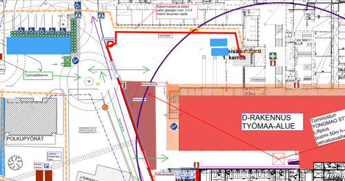 - Vanhan pääsisäänkäynnin ympäristössä muokataan hieman työmaa-aitojen sijoittelua. Jalankulku pysyy ennallaan, mutta jalankulkuväylän ja työmaan välinen ajoväylä poistetaan. Aita sijoitetaan niin, että jalankulkuväylää levitetään noin 3,5-4 metrin levyiseksi. Muokkaus suoritetaan viikolla 8.