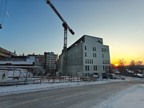 Työmaalla käynnissä julkisivun eristystyöt, IV-kattokonehuoneen rungon asennus, väliseinämuuraus, pintalattioiden valutyöt sekä työmaa-aikaisen hissin asennus.