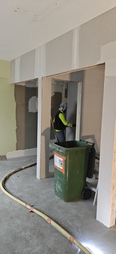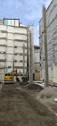 Työmaalla käynnissä julkisivun eristystyöt, väliseinämuuraus, pintalattioiden valutyöt, katon höyrysulkuasennus, viemäriputkiasennus ja tekniikan uritukset tiiliväliseiniin.