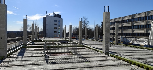 Työmaalla käynnissä julkisivun eristystyöt, IV-kattokonehuoneen rungon asennus, väliseinämuuraus, pintalattioiden valutyöt, sekä tiiliseinien sähköjohtojen roilotus.