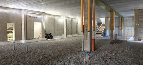 Työmaalla käynnissä julkisivun eristystyöt, IV-konehuoneen kattotyöt, väliseinämuuraus, pintalattioiden valutyöt, höyrysulkuasennus, viemäriputkiasennus, lattialämmitysputkien asennus ja tekniikan uritukset tiiliväliseiniin.