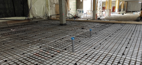Työmaalla käynnissä julkisivun eristystyöt, IV-konehuoneen seinäelementtien asennus, väliseinämuuraus, pintalattioiden valutyöt, katon kallistusvalut, lattialämmitysputkien asennus ja tekniikan roilotukset tiiliväliseiniin.
