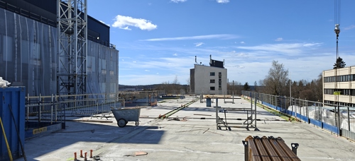 Työmaalla käynnissä julkisivun eristystyöt, IV-kattokonehuoneen rungon asennus, väliseinämuuraus, pintalattioiden valutyöt sekä työmaa-aikaisen hissin asennus.