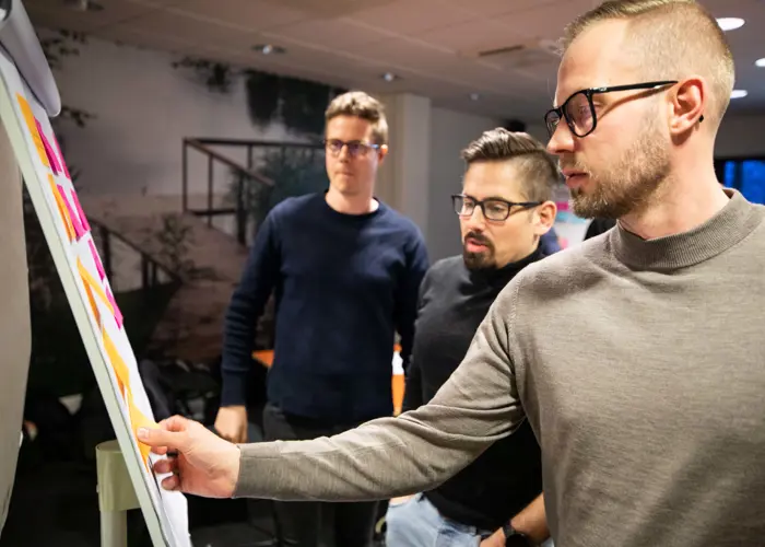 Vilkas puheensorina täyttää tilan, kun hartelalaiset kommentoivat toistensa ajatuksia onnistuneen hankkeen edellytyksistä. Työpäällikkö Toni Päkkilä kirjoittaa lapulle ”henkilöstön motivaatio ja jaksaminen”. Hän nostaa lapun kiinni tauluun, ja ryhmän kaikki kollegat laittavat siihen merkinnän. Tämä on avainasia.