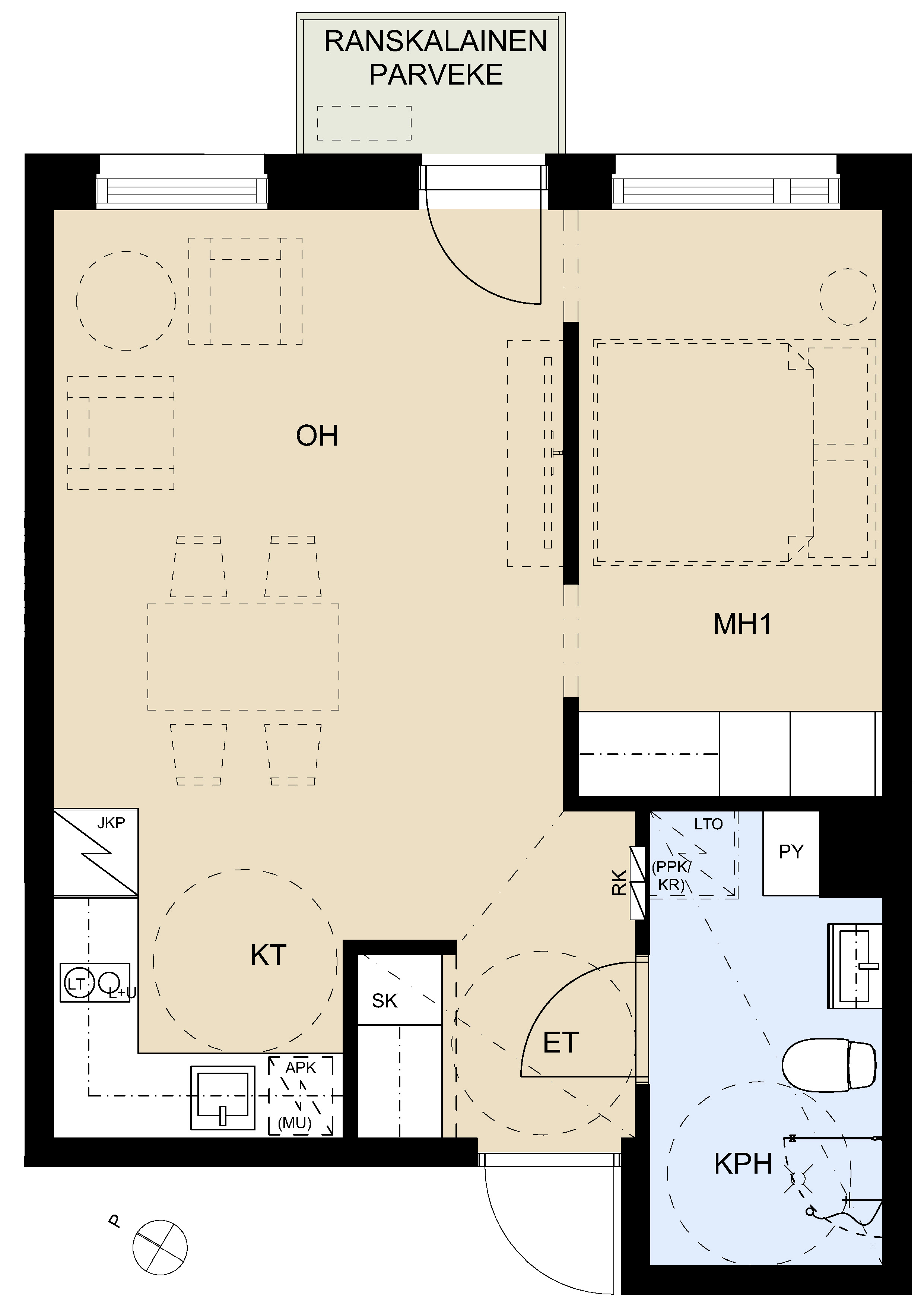Tämä kompakti kaksio tarjoaa avaraa ja toimivaa tilaa pariskunnalle tai yksin asuvalle arjen kiireiden keskelle. Makuuhuoneen liukuovet tuovat tarvittaessa rauhaa, ja avoimina ne luovat valoisan ja avaran tunnelman koko asuntoon. Pieni avoparveke / ranskalainen parveke kutsuu viettämään rentouttavia hetkiä, parvekkeelle mahtuu mukavasti tuoli ja kahvihetki. Asuntopohjasta voi valita kahdesta eri vaihtoehdosta keittiöratkaisujen osalta: L-mallinen keittiö avautuu olohuoneeseen luoden yhtenäisen ja viihtyisän oleskelutilan, kun taas I-mallinen keittiö on niemekkeen ja seinän avulla oma tilansa, mutta säilyttää silti yhteyden olohuoneeseen, jolloin kokkailu ja seurustelu onnistuvat yhtä aikaa.