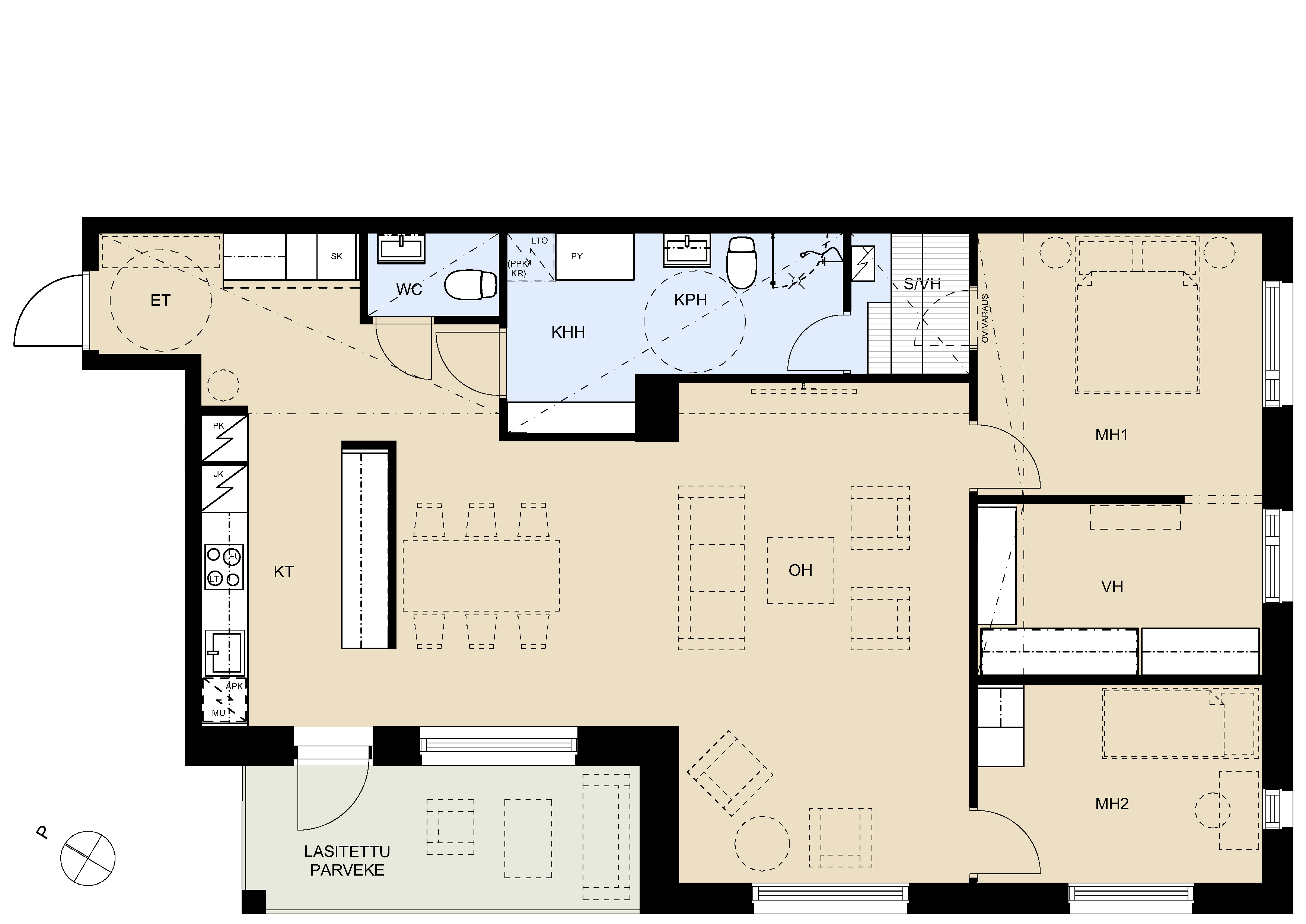 Tämä koti tarjoaa kolme erilaista pohjaratkaisua, joista voit valita elämäntilanteeseesi parhaiten sopivan. Voit valita valmiiksi suunnitelluista asuntopohjista sinulle mieluisimman tai voit myös yhdistellä valmiista pohjista juuri sinulle sopivan pohjaratkaisun. Ensimmäisessä vaihtoehdossa on kolme makuuhuonetta ja keittiön saareke. Toisessa vaihtoehdossa on kaksi makuuhuonetta, joista toisen yhteydessä on iso, valoisa vaatehuone, joka toimii myös pukeutumistilana. Keittiön ja olohuoneen välinen seinäke tuo rauhaa kokkailuun ja tarjoaa kätevästi lisäsäilytystilaa pienkoneille ja arjen tavaroille. Kolmannessa vaihtoehdossa on kaksi suurta makuuhuonetta, joista isompi sopii vaikka kahdelle lapselle, ja keittiön saareke sopii hyvin ruuanlaitosta nautiskeleville, mahdollistaen yhdessäolon arki-illallisilla. Kylpyhuoneen yhteydessä on kodinhoitotila, jossa pyykkihuolto ja säilytys hoituvat helposti. Kaikissa pohjissa on oma sauna. Saunan tilalle voi halutessaan toteuttaa vaatehuoneen, jos tarvitset runsaasti säilytystilaa