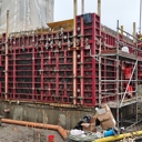 Työmaalla käynnissä julkisivun eristystyöt, IV-kattokonehuoneen rungon asennus, väliseinämuuraus, pintalattioiden valutyöt sekä työmaa-aikaisen hissin asennus.