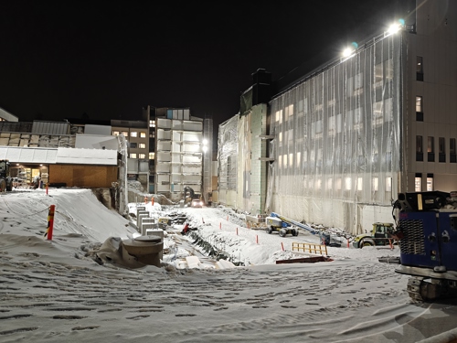 Työmaalla käynnissä rungon elementtiasennus ja itäpäädyn KVV-liittymät.