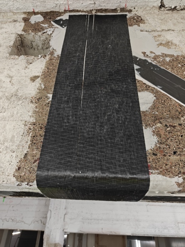 A-osalla vanhoja palkkeja vahvistettiin hiilikuituvahvisteilla ennen uusien läpivientien poraamista: