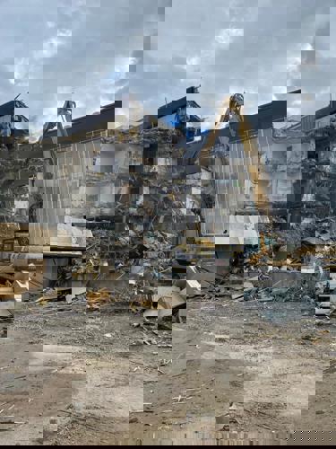 AK-lohkon rungon purku käynnissä. Sairaalan pääsisäänkäynnin ympäristöä varattu purkutyöalueeksi.